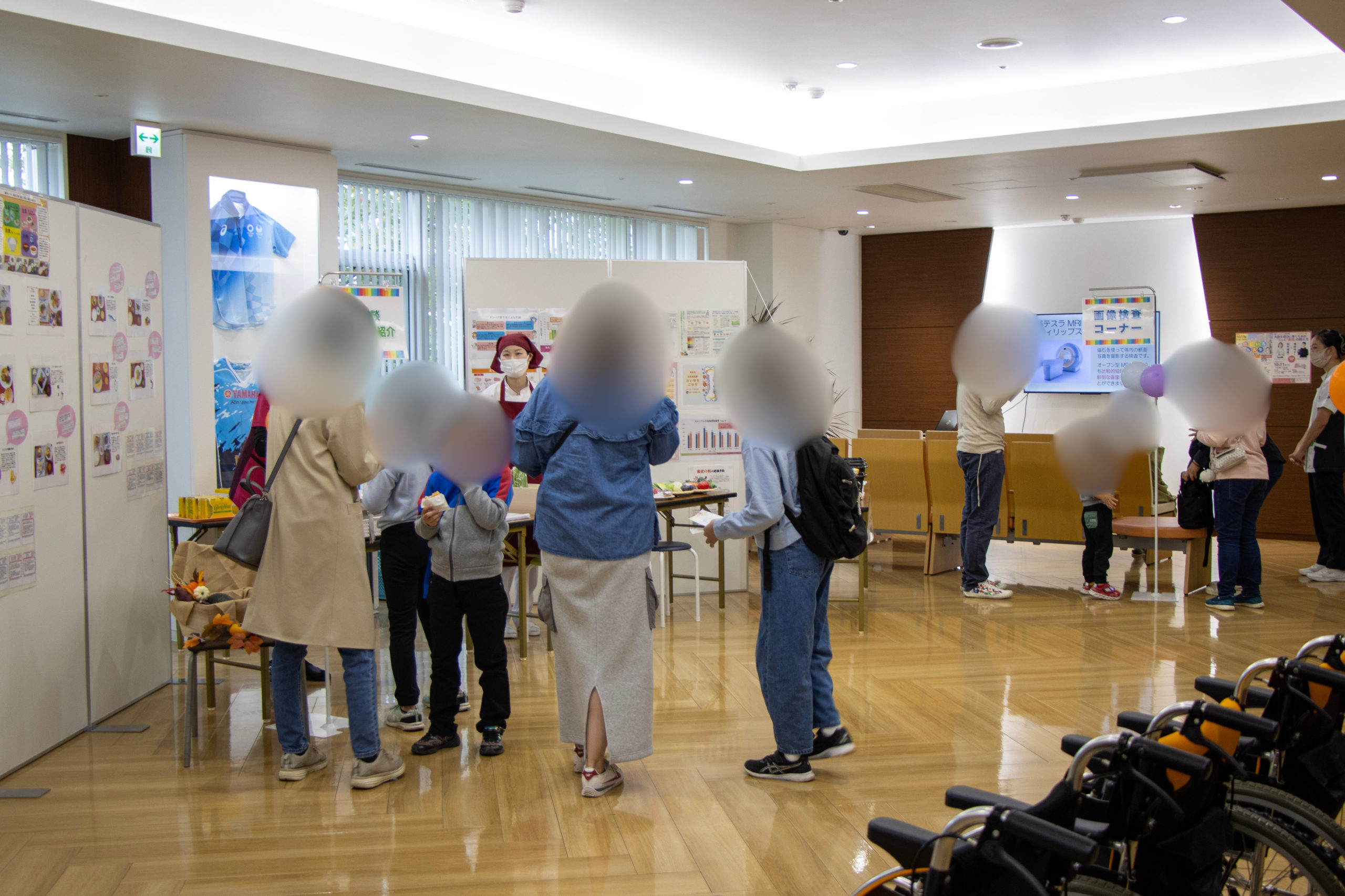 1階では看護部・給食部・放射線部による専門的な展示や体験コーナー。血圧測定・松葉杖車いす体験・レントゲンのしくみ紹介等多くの方が興味を持ってくださり、なかでも病院食試食の梅コロッケは大変ご好評をいただきました。